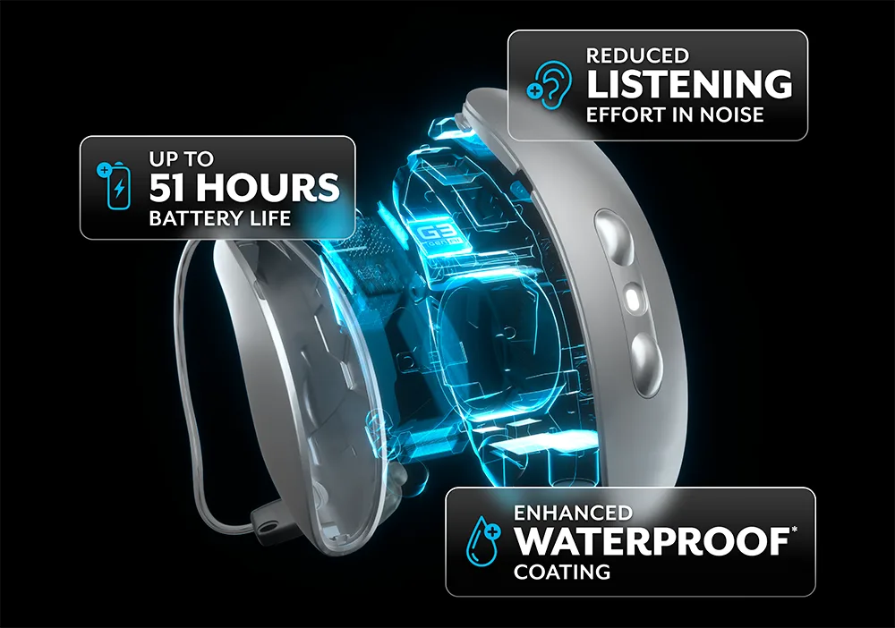 With a 10X more durable waterproof coating4, Omega AI hearing aids are designed to withstand the elements and keep up with your lifestyle. Rain, sweat, or accidental drops of water won’t hold you back. These devices are waterproof1, everyday-proof, and built to last, giving you peace of mind no matter where your day takes you.